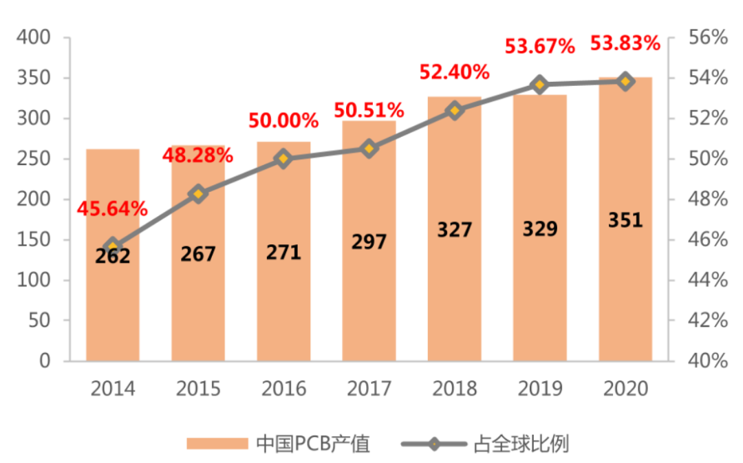 從(cong)2006年開始(shi),中國的(de)PCB産值便(bian)超過了(le)日本成(cheng)爲了全(quán)球最大(da)的生産(chǎn)基地,2020年(nian)産值占(zhàn)比更是(shi)達到了(le)全球的(de)53.8%。有趣的(de)是,盡管(guan)全球的(de)PCB市場呈(chéng)現了一(yi)定的周(zhōu)期性,但(dan)中國的(de)PCB産值卻(que)在不斷(duan)攀升🔆,2020年(nian)國内🚶♀️PCB闆(pan)行業産(chan)值規模(mó)達超過(guò)350億美元(yuán)。
