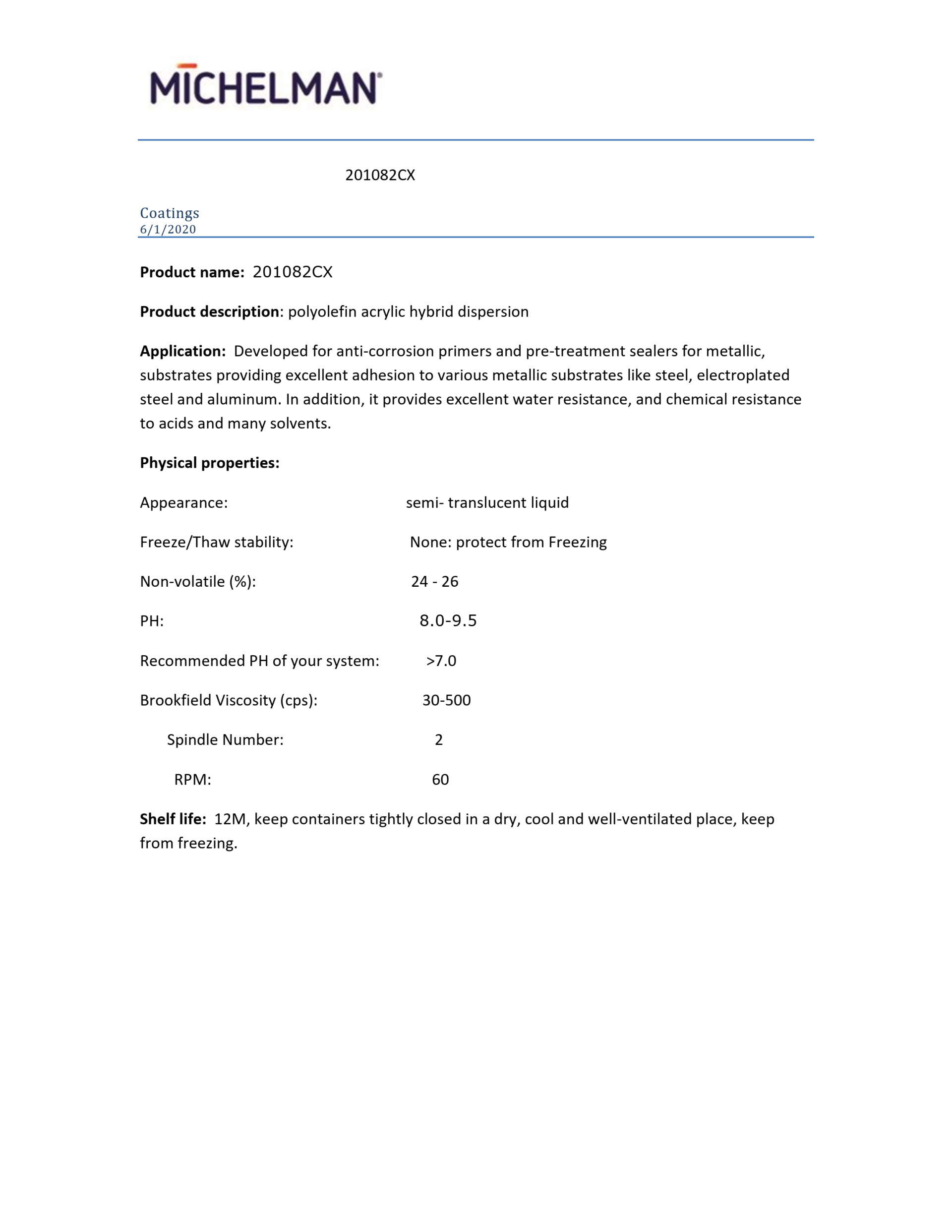 Application: Developed for anti-corrosion primers and pre-treatment sealers for metallic, substrates providing excellent adhesion to various metallic substrates like steel, electroplated steel and aluminum. In addition, it provides excellent water resistance, and chemical resistance to acids and many solvents.