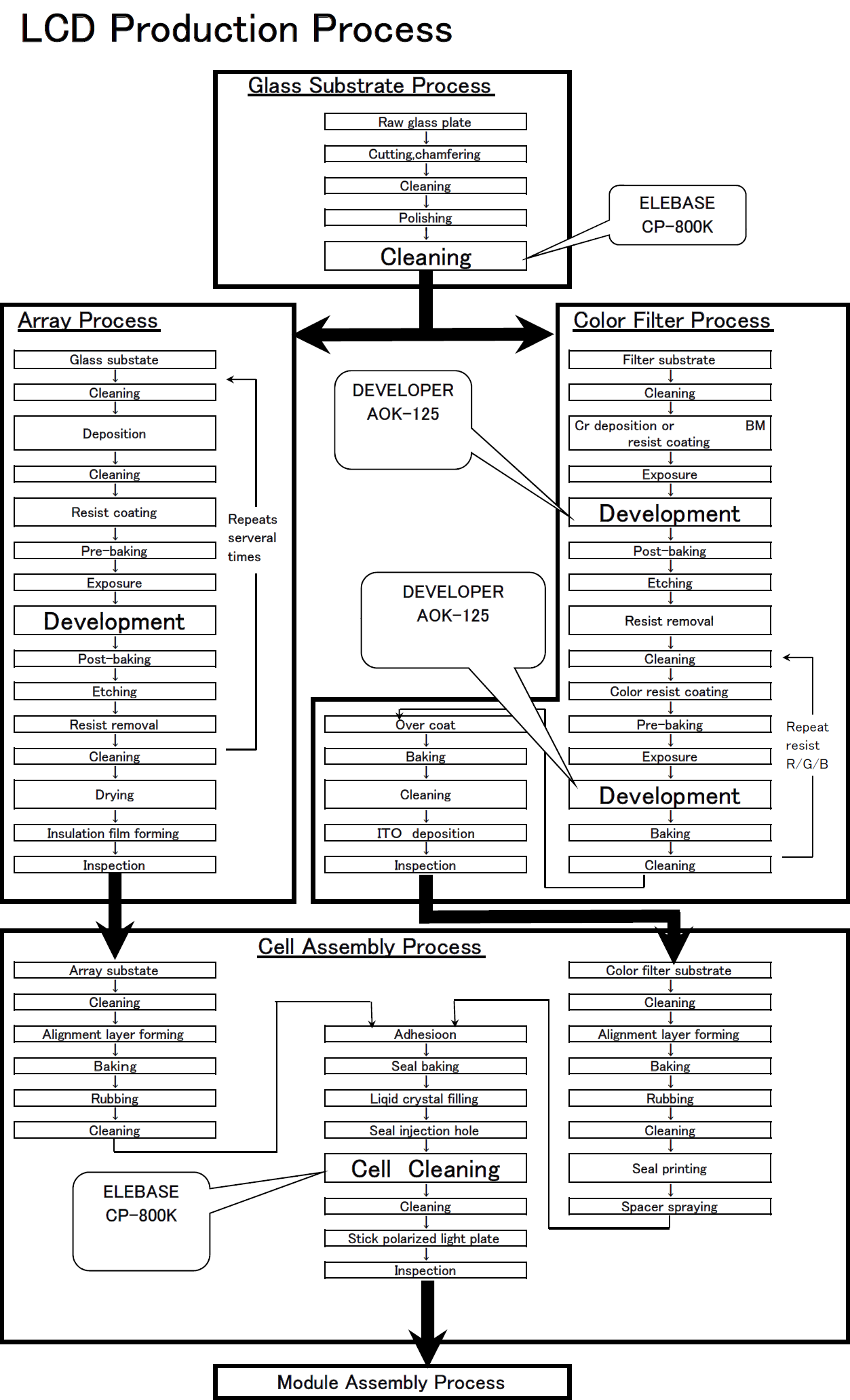 LCD生産過程使(shi)用的濕化學品(pin)(表面活性劑、清(qing)洗劑、顯影液👉)。