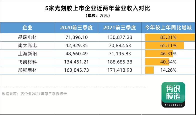 在營業收(shōu)入方面,5家光(guāng)刻膠企業較(jiao)上年同期皆(jie)呈增長💜态勢(shi),且漲幅差距(ju)總體而言較(jiào)小,其中增長(zhang)幅度最大的(de)是晶瑞電材(cái),同比增長達(dá)83%;增長幅度最(zuì)小的是彤程(chéng)新材,同比增(zēng)長達14%。從營收(shōu)數據而言,飛(fei)凱材料、彤程(cheng)新材及晶瑞(rui)電材穩定保(bǎo)持在“營收10億(yi)以上俱樂部(bù)”。