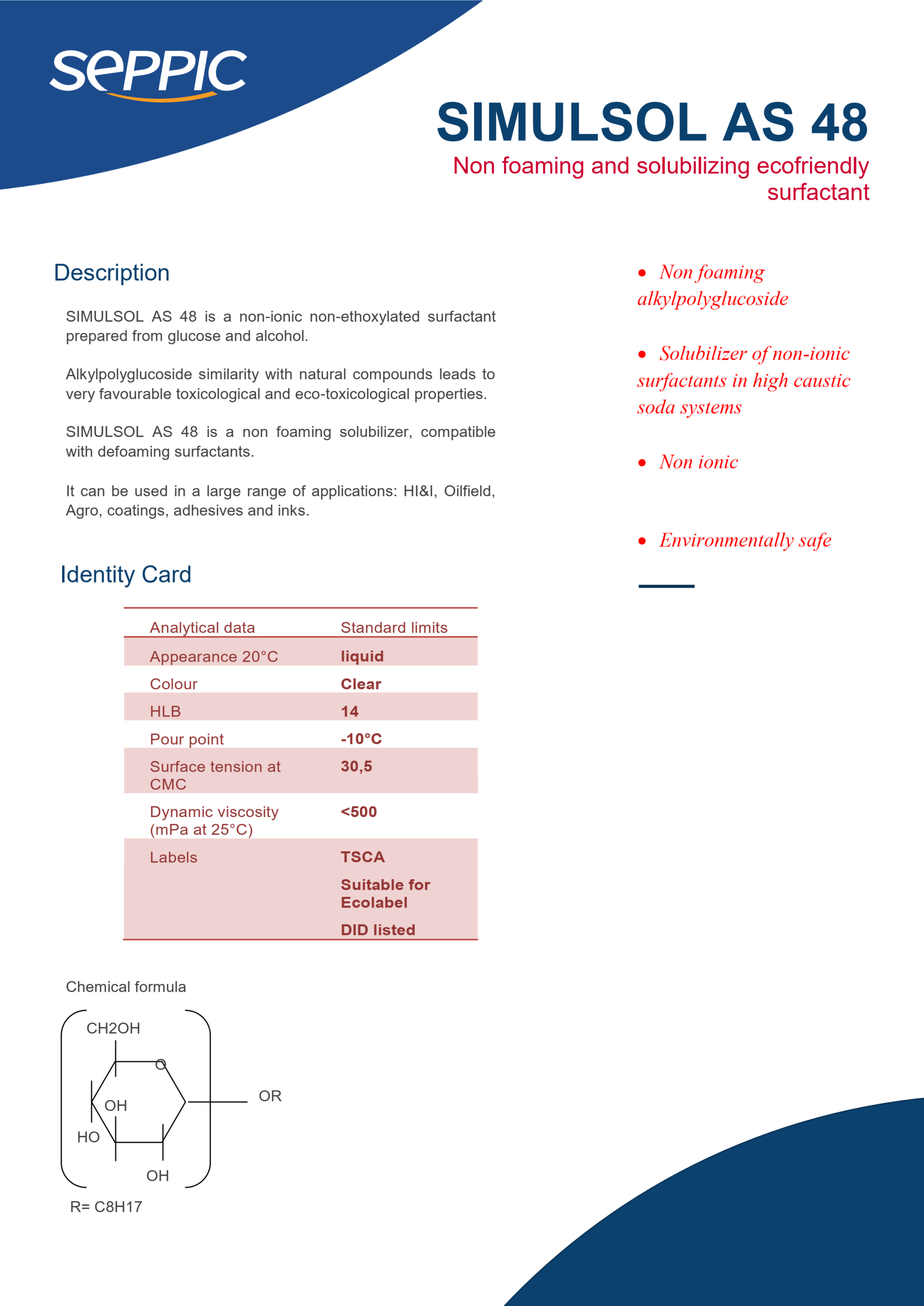 SIMULSOL AS 48 is a non-ionic non-ethoxylated surfactant prepared from glucose and alcohol. Alkylpolyglucoside similarity with natural compounds leads to very favourable toxicological and eco-toxicological properties.