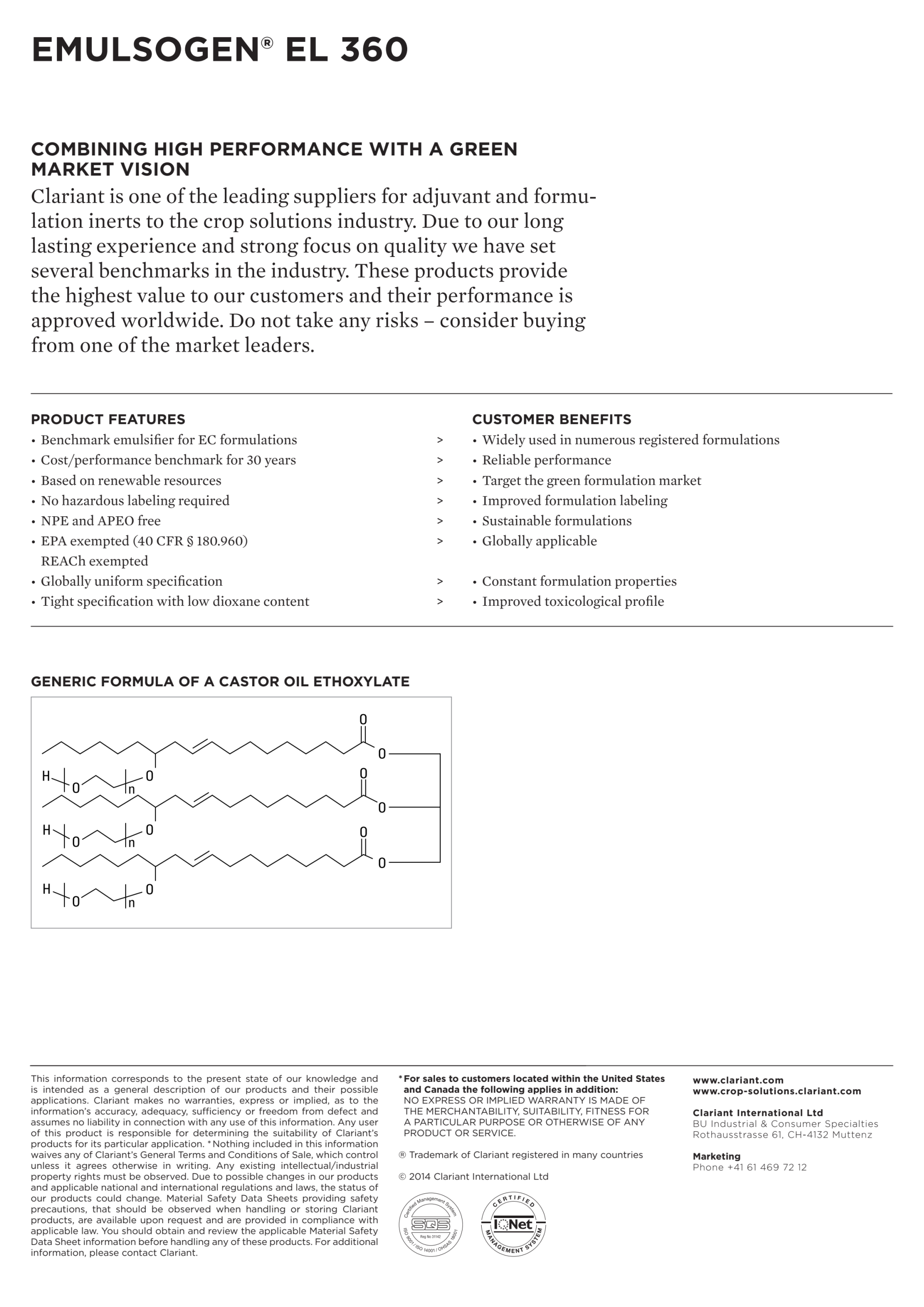It is always advisable to tailor the combination of Emulsogen EL 360 and the anionic components mentioned above to the active ingredients, solvents and concentrations used and make it as effective as possible.