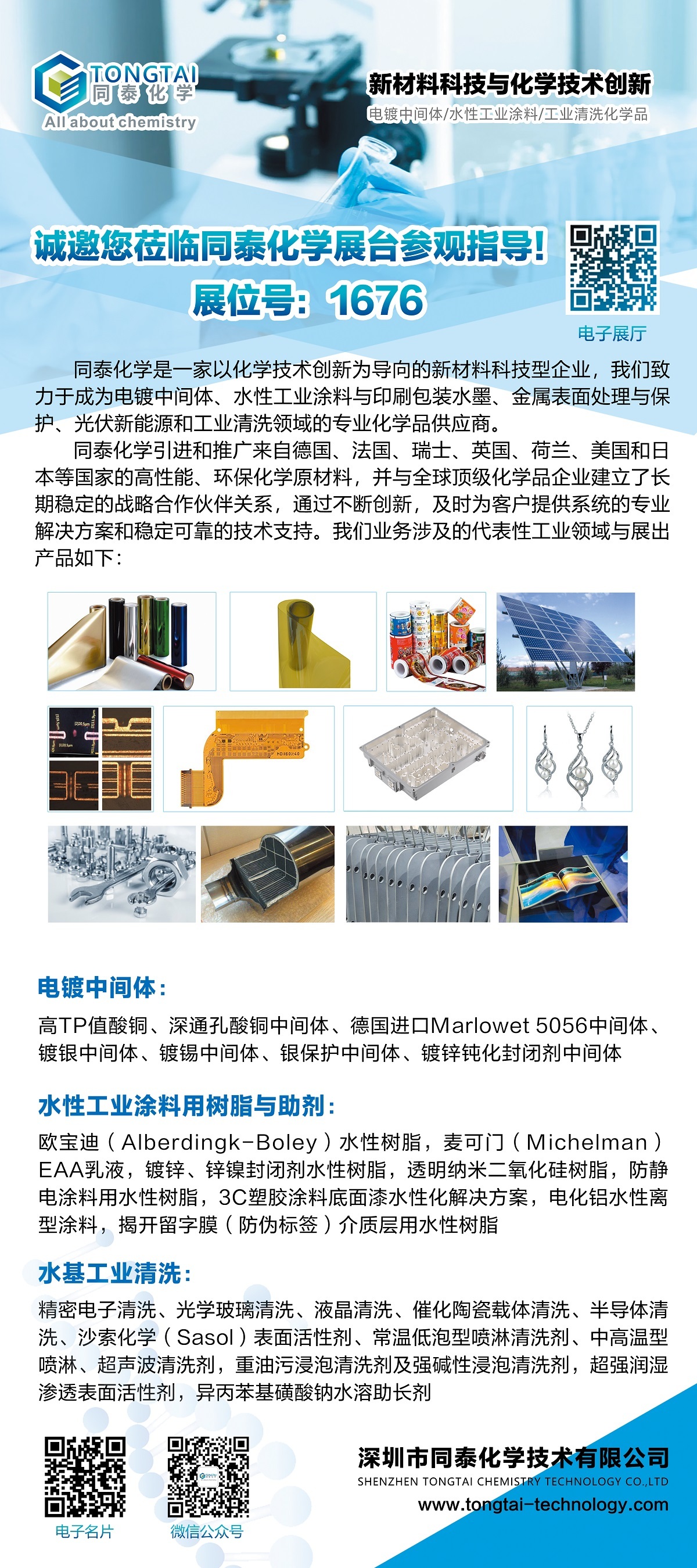 深(shen)圳市同泰化學技(ji)術有限公司将參(cān)加2021年9月27-29日在廣✂️州(zhou)保👌利世⛹🏻♀️貿博覽館(guǎn)舉辦的第十四屆(jie)廣州國際表面處(chù)理✊、電鍍🌈、塗裝展覽(lǎn)會,即【廣州國際表(biǎo)面處理🌐展】,誠邀您(nín)莅臨同泰化學展(zhǎn)台🔴參觀指🏃♂️導!展位(wei)号:1676。