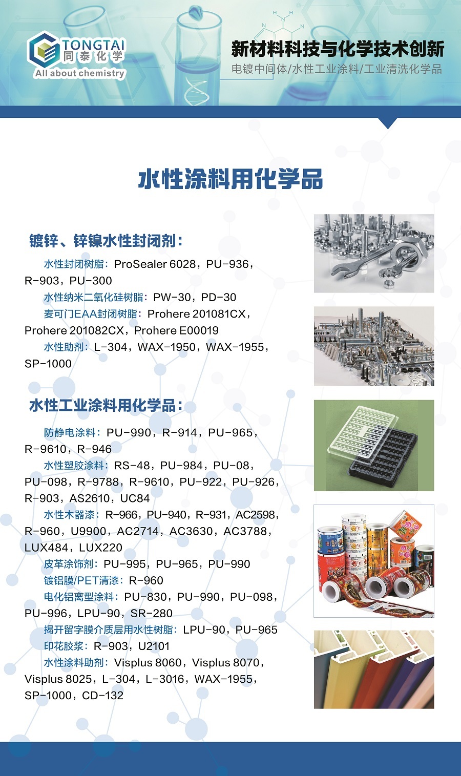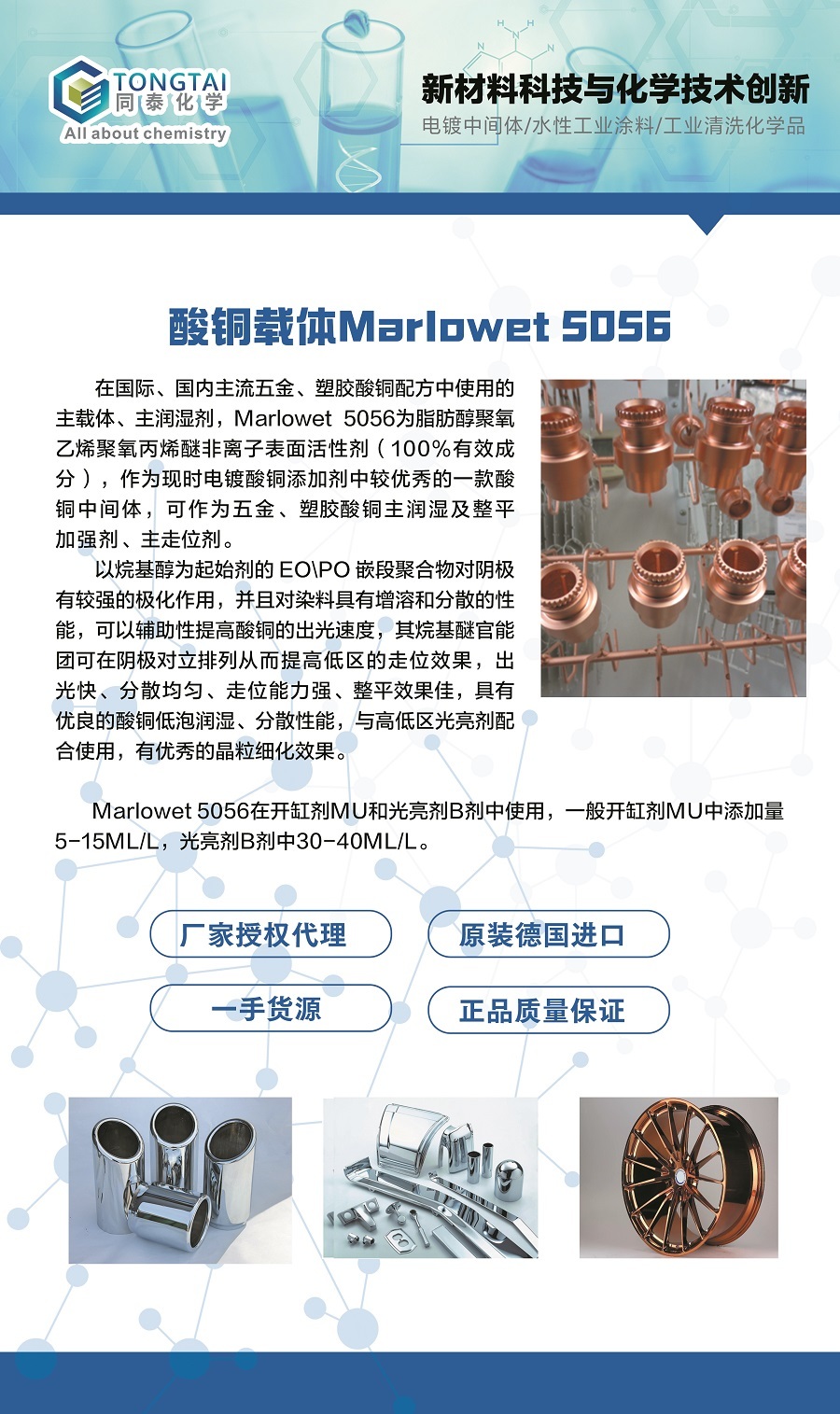 五金(jin)、塑膠酸性(xing)鍍銅中間(jian)體:PAS-A-5,Marlowet 5056,SN-6011,SN-6008,SM-560,SN-2022,Leveler 8010,Leveler 8016,C-1800;